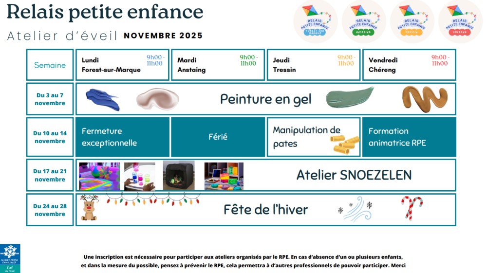 Planning des ateliers d'éveil du Relais petite enfance - Novembre 2025 Détails Catégorie : Le Relais Petite Enfance (RPE) Création : mercredi 22 octobre 2025 13:39 Mis à jour : mercredi 22 octobre 2025 13:47 Publication : mercredi 22 octobre 2025 13:39 Écrit par Service administratif Suivant