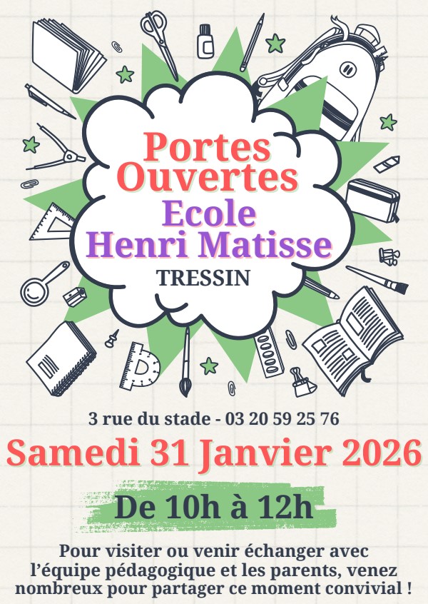 Nous vous proposons de venir le samedi 31 janvier de 10h à 12h, aux portes ouvertes de l'école Henri Matisse au 3 rue du Stade à Tressin.