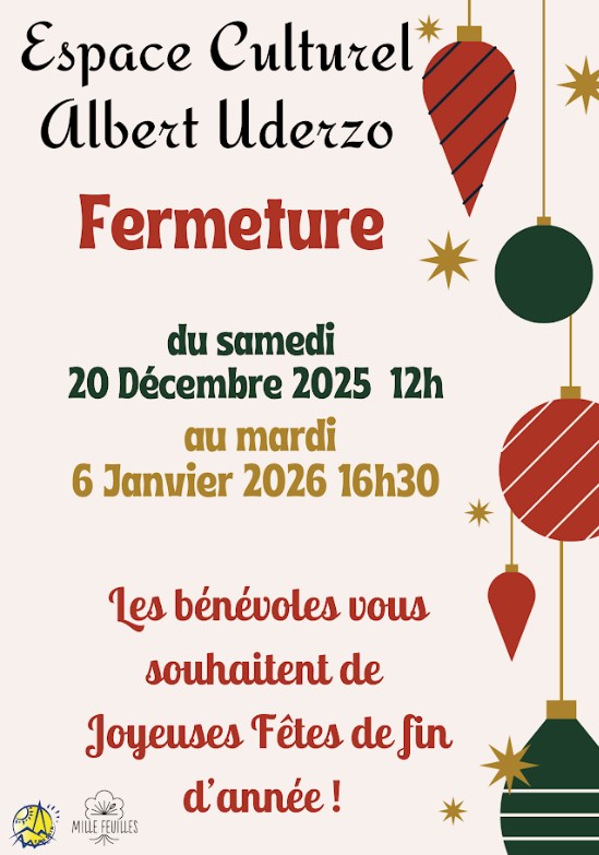 Horaires de fermeture de l'Espace Culturel Albert Uderzo pour les fêtes de fin d'année 2025 Détails Catégorie : L'espace culturel Création : lundi 24 novembre 2025 15:25 Mis à jour : lundi 24 novembre 2025 15:26 Publication : lundi 24 novembre 2025 15:25 Écrit par Service administratif