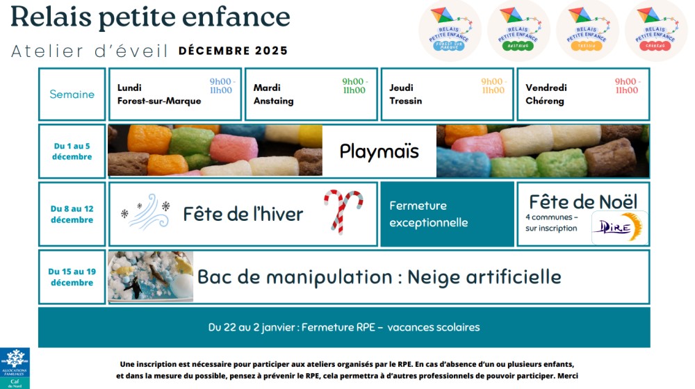Planning des ateliers d'éveil du Relais petite enfance - Décembre 2025 Détails Catégorie : Le Relais Petite Enfance (RPE) Création : mardi 25 novembre 2025 15:37 Mis à jour : mardi 25 novembre 2025 15:40 Publication : mardi 25 novembre 2025 15:38 Écrit par Service administratif