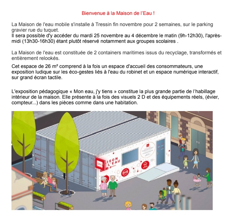 Du mardi 25 novembre au jeudi 4 décembre en matinée : la Maison de l'Eau s'installe à Tressin, sur le parking gravier rue du Tuquet (un espace d'accueil des consommateurs, une exposition ludique sur les éco-gestes et un espace numérique interactif)