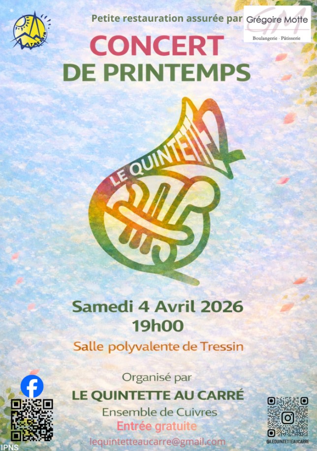 Le Quintette au carré : concert de printemps le samedi 4 avril 2026 à 19h en Salle polyvalente de Tressin Détails Catégorie : Les événements Création : vendredi 20 mars 2026 08:01 Mis à jour : vendredi 20 mars 2026 08:02 Publication : vendredi 20 mars 2026 08:01 Écrit par Service administratif Suivant