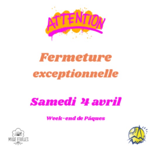 Fermeture exceptionnelle de l'Espace Culturel Albert Uderzo le samedi 4 avril 2026 Détails Catégorie : L'espace culturel Création : jeudi 22 janvier 2026 14:27 Mis à jour : jeudi 19 mars 2026 14:57 Publication : samedi 21 mars 2026 15:26 Écrit par Service administratif Merci pour votre compréhension Précédent Suivant